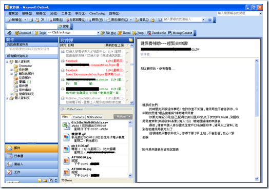 要先提醒一下,我在一開始用的是Outlook 2003 SP2,不知道為何安裝之後,原先的通訊錄不能用來發mail ,升級成 SP3之後就又可以了。以下文章中就直接稱呼Outlook,不另加註版本。
