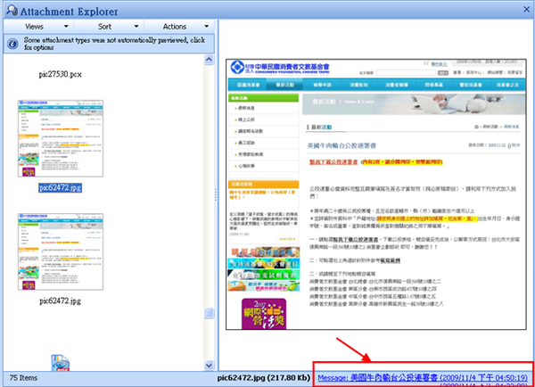 在這裡,可以直接對jpg與gif 格式的圖檔進行預覽。當朋友寄來一堆圖片的時候,再也不用一個一個去打開來看。而點選小圖的話,在右側欄位會出現大圖。