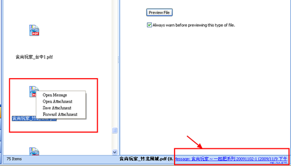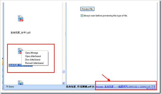 除了顯示大圖之外,還會在右下角標出圖檔是在哪一封mail 中,點選右下角這裡,就可以打開原始mail。其他種類的檔案,如PDF,無法進行預覽,但在選取時,仍會標出檔案所在的mail,而如果真要打開檔案,只要按滑鼠右鍵,選擇【Open Attachment】即可。