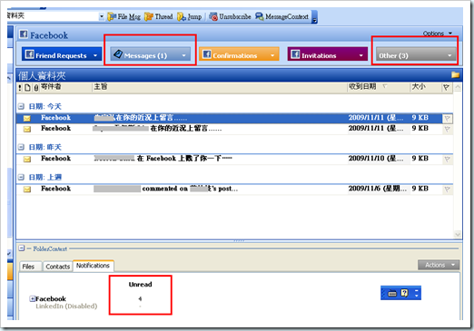 如果有FaceBook的話,一堆訊息寄送過來是不是很困擾?ClearContext特別內建一個FaceBook訊息通知器,除了把FaceBook寄發的訊息統一管理之外,還可以分門別類,讓你判斷哪個訊息要先閱讀。