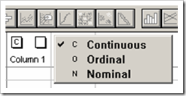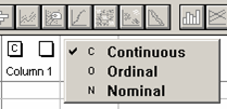 JMP3 把資料格式分成三種,通常我僅用N &C 兩種。c: Continuous ,就是一般的數字。N:Nominal 就是文字, o:Ordinal 我就不是很清楚,因為好像也沒有必要用到 。