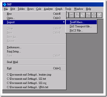 接著就是要把資料輸入JMP3, 點選方式如下圖: