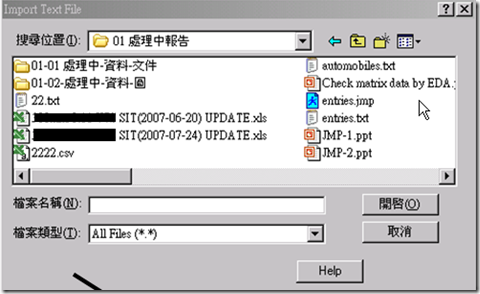 就資料格式來說 ,JMP3是可以讀取*.txt,即便我有時會用到*.txt 的資料檔案,我還是會用Excel 先處理一下。這裡所謂的處理,其實跟我用的數值資料有關。