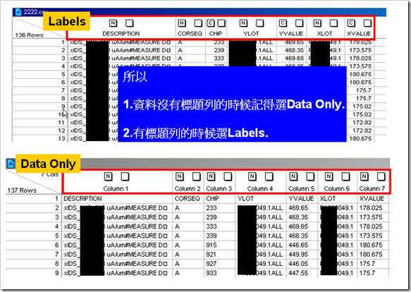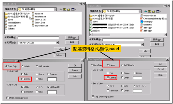 先說下面的地方。注意到要點選 Comma ,因為 *.cvs 就是用 Comma(逗點)分隔資料。那上面的 Data Only 與Labels有差嗎? 下圖是兩者在JMP 3內的差異: