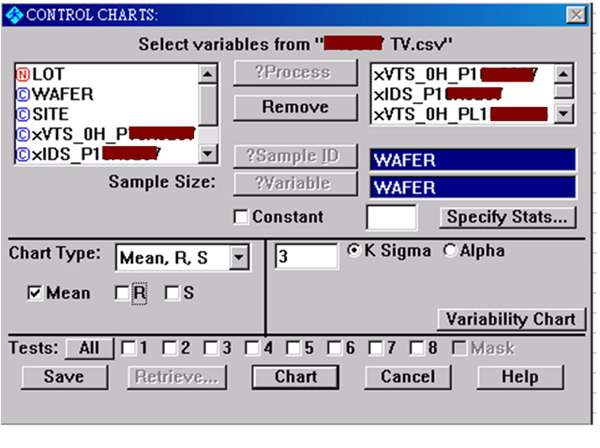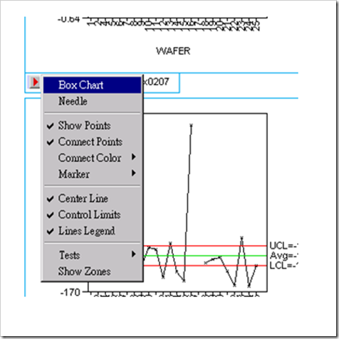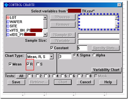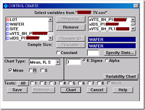 我通常都是用 BoxChart來做圖, 因為資料分佈的範圍也是一種很好的參考。同時因為這功能是預設要來設定spec,所以會有control limits,為避免誤會,要把它取消掉。不過這一個步驟就是要一筆一筆來做。