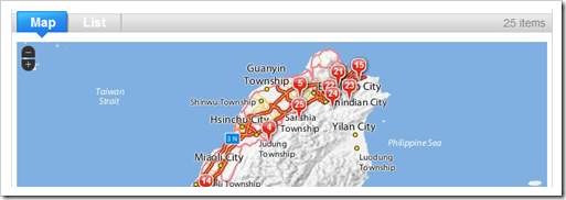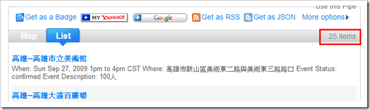 輸入XML後,Run Pipe。結果會顯示出25個項目,可以用Map顯示或表列。