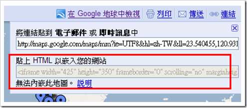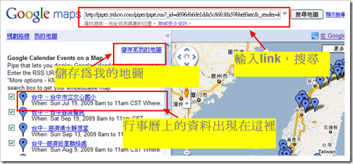 用複製鏈結網址的作法,在存成我的地圖後,無法用嵌入語法。根據我測試的結果,其實不要存成我的地圖,是可以用嵌入語法的。這種作法的好處是,可以跟行事曆同步。但作者認為,由於搜尋的鏈結來自Yahoo Pipe,可能有時不太穩定,他建議採鏈結另存新檔。不過這種作法就無法與行事曆同步。