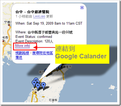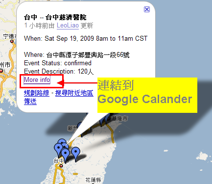 每個月我都要更新一下骨髓活動的時間與地點,由於活動是在全國輪流舉辦,我覺得有Google map比較方便。不過要在Google map上同時顯示地點跟時間,可能loading會太重。最近看到一篇文章,介紹一個方便的方法可以在Google map上顯示Google行事曆上的資料。原文link在此 :http://ouseful.open.ac.uk/blogarchive/012594.html