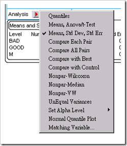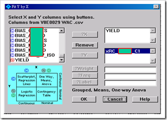 前篇提到用Control Chart來做單一參數的比較,這次是用正統的Fit Y by X來做比較。當一批lot有些良率OK,有些不好,就可以用這種方法來比較。按鍵如下所示。